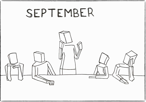 Immer im Herbst taucht ein Thema für einen uniformen Kalender auf. Die quaderförmigen Figuren symbolisieren die Einsamkeit der Menschen.