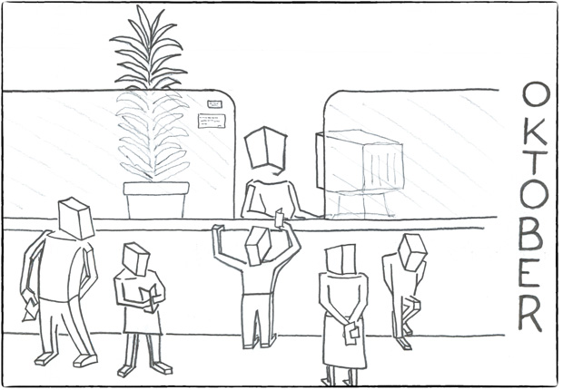 Immer im Herbst taucht ein Thema für einen uniformen Kalender auf. Die quaderförmigen Figuren symbolisieren die Einsamkeit der Menschen.
