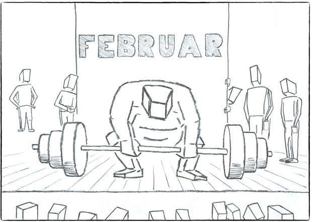 Immer im Herbst taucht ein Thema für einen uniformen Kalender auf. Die quaderförmigen Figuren symbolisieren die Einsamkeit der Menschen.